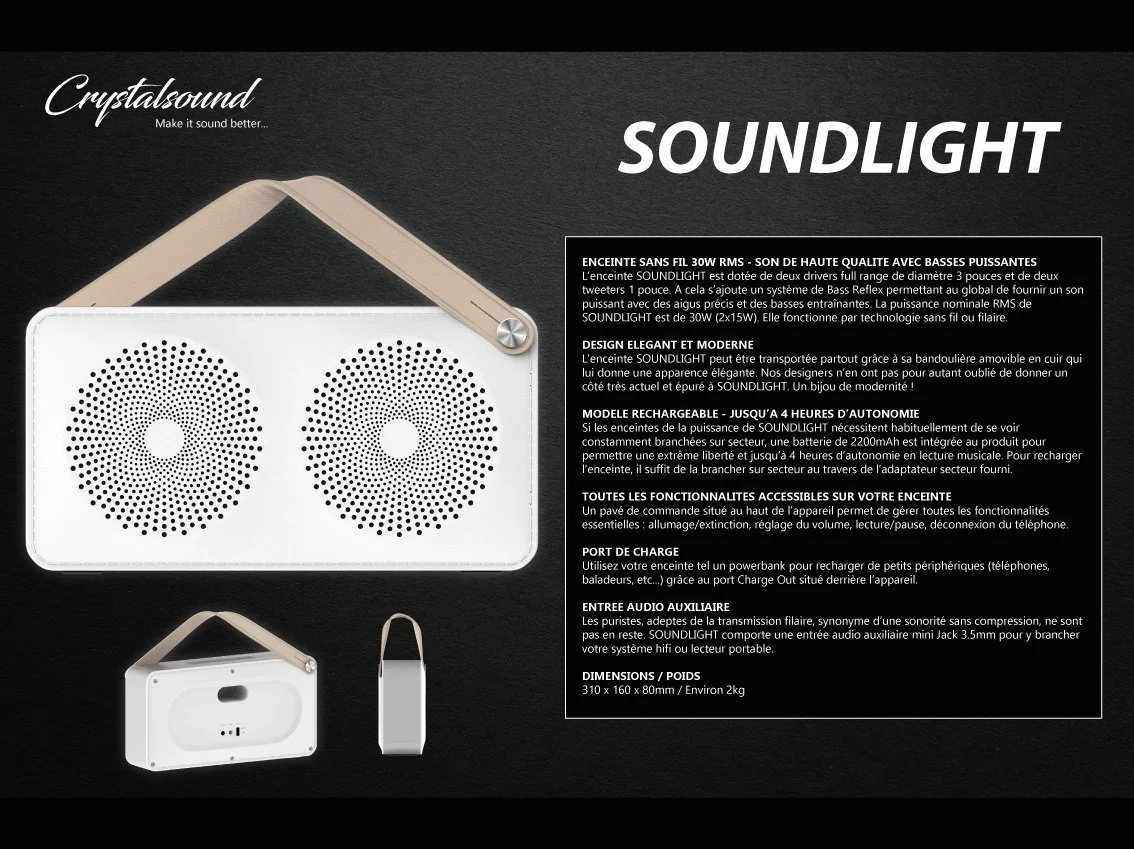 Parée d’un design moderne avec une sangle en cuir amovible, l’enceinte Crystalsound™ SOUNDLIGHT est l’alliée idéale pour vos soirées mais aussi pour profiter d’un son puissant et d’excellente qualité. Ressentez la profondeur de ses basses grâce à son système Bass Reflex. Pour parfaire ses capacités de reproduction, elle intègre pas moins de 2 drivers 3 pouces et 2 tweeters 1 pouce. Nul besoin de la laisser constamment branchée sur secteur ! Malgré sa puissance importante, SOUNDLIGHT comporte une batterie 2200mAh pour une plus grande liberté et jusque 4 heures de musique ! Dernières options non négligeables, un port de charge USB situé au dos de l’enceinte ainsi qu’une entrée audio auxiliaire.